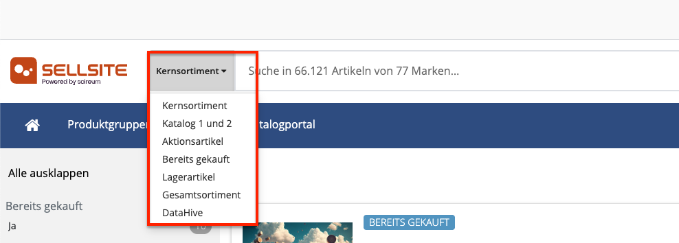 | Kernsortiment | Bei der Auswahl des Filters Kernsortiment werden ausschließlich Artikel in der Trefferliste angezeigt, die direkt in SellSite angelegt wurden. |